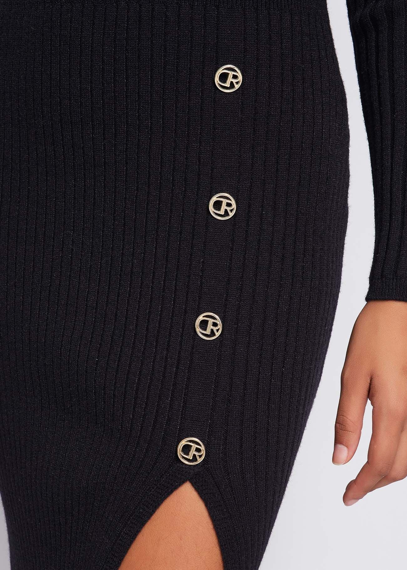 Abito in maglia di misto viscosa lavorata a coste con bottoni sul davanti. Il modello ha scollatura quadrata, maniche lunghe e spacco sul davanti.